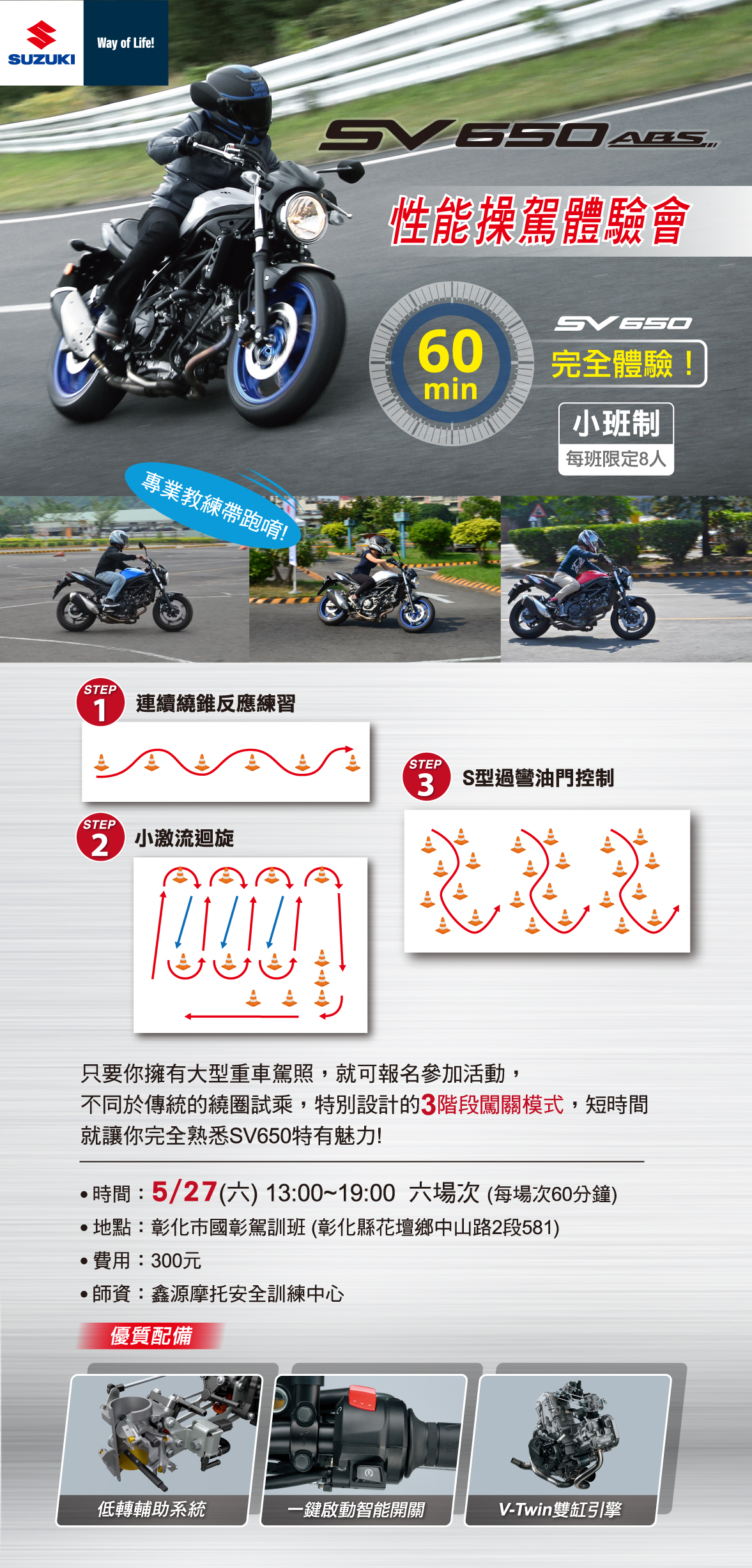 超人氣日本進口街車SV650 令人引頸期盼的性能操駕體驗會又來了! 5/27(六) 13:00~19:00 (六場次) 全新的關卡體驗,透過專業教練的介紹指導, 讓你以更全面的角度體驗SV650的操駕感受! 這次60分鐘 小班制(一梯次8人) 讓你真正完全體驗!