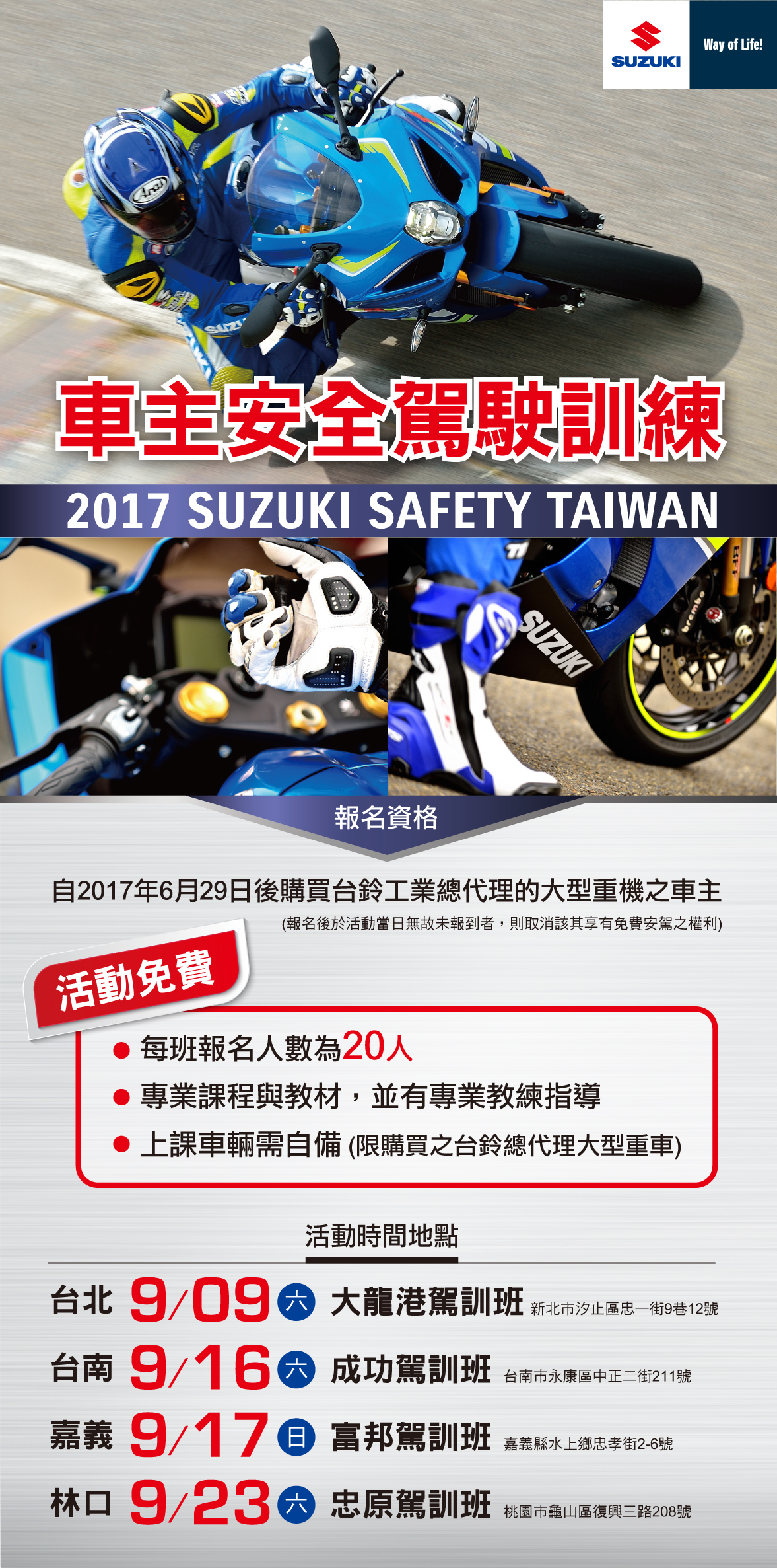 9月份SUZUKI 車主安全駕駛訓練課程來囉! ※自 2017年6月29日 起購買台鈴工業總代理的大型重機(不限機種)之車主, ※即可免費參加! ※車輛自備限購買之台鈴總代理大型重機 全日(10:00~16:00)專業教練指導,專業教材授課,專業場地訓練。