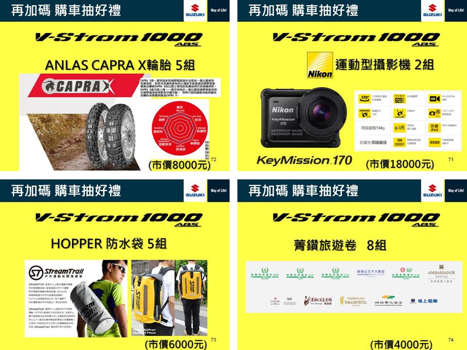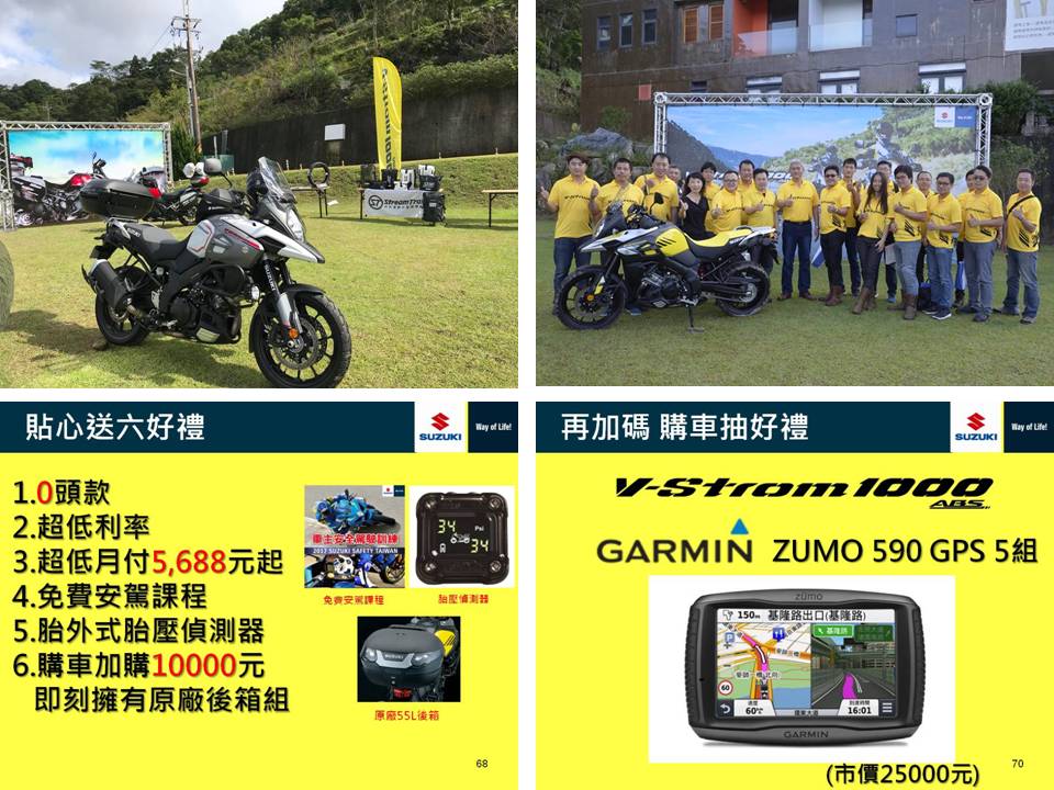在考量消費者購車財務規劃的前提下,台鈴 SUZUKI 資深經理 林進賢表示:「為滿足消費者能充分體驗 V-STROM 車系的冒險性格,我們推出輕鬆購好禮專案,現在購車立享零頭款、超低利率、搭配首年低月付 5,688 元超優惠方案,即可入主同級距優質跨界多功能強悍機種 V-STROM 1000,同時再加贈 SUZUKI 胎外式胎壓偵測器,更可享有加價購 10,000 元即可享有價值 20,000 元之 SUZUKI 原廠 55L 後箱組。」為慶祝 V-STROM 1000 挑戰北極圈成功及 2018 年式 V-STROM 1000 發表,即日起至今年 12 月底前購買 2017 年式 V-STROM 650 及 2018 年式 V-STROM 1000 並完成領牌者, 可特別享有 20 萬好禮大抽獎,包含 NIKON KeyMission 170 運動型相機、ANLAS CAPRA X 前後輪胎組、ST Hopper 防水袋、GARMIN ZUMO 590 重車專用導航機、菁鑽旅遊卷等超級好禮大抽獎,配額有限,請立即行動。(2018 年 1 月將抽出幸運得獎車主,活動內容以台鈴 SUZUKI 公告為準)台鈴 SUZUKI 持續推廣 SUZUKI SAFETY 的安全駕駛觀念,凡購買 V-STROM 車系大型重型機車的車主,將贈送「SUZUKI 安全駕駛訓練課程」,自領牌日起半內 有效,請立即洽詢全國台鈴 SUZUKI 授權經銷商,您的冒險無畏旅程、立即啟動。