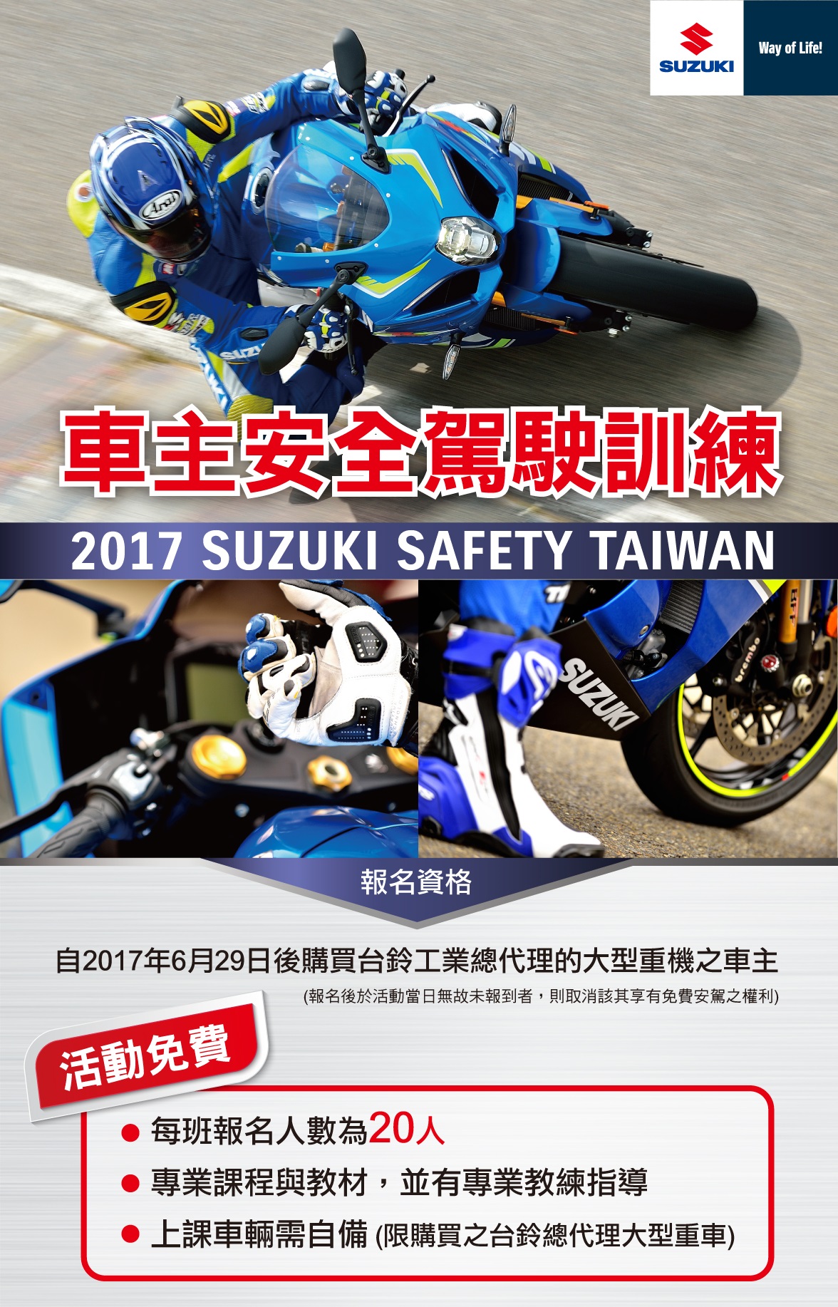 【2017 SUZUKI SAFETY TAIWAN】 SUZUKI 車主安全駕駛訓練課程來囉! . 12/3 in 彰化 國彰駕訓班 . ※自 2017年6月29日 起購買台鈴工業總代理的大型重機(不限機種)之車主, ※即可免費參加! ※車輛自備限購買之台鈴總代理大型重機 全日(10:00~16:00)專業教練指導,專業教材授課,專業場地訓練。 小班制,每班20人!趕緊來報名! . 報名網址:https://goo.gl/s2r5e4