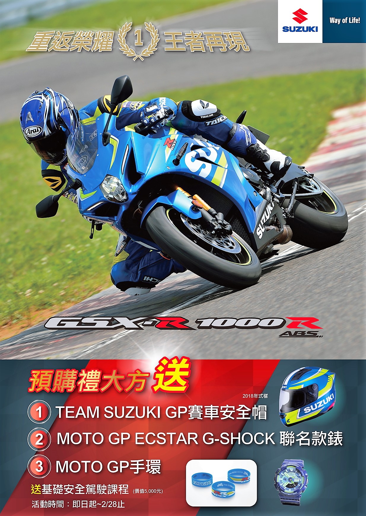 2018年01月10日台灣台北市 - 台鈴SUZUKI為感謝支持GSX-R1000的消費者,針對2018年式GSX-R1000R正式展開預購活動,凡於2/28前預購2018年GSX-R1000R的準車主,可享有價值高達約15,000元的限量限定三好禮,TEAM SUZUKI ECSTAR MOTOGP 台灣限定DOT安全帽、MOTOGP ECSTAR G-SHOCK聯名手錶、SUZUKI MOTOGP塗裝手環,好禮絕無僅有,欲購從速,立即體驗駕馭GSX-R1000R的絕佳操駕快感。