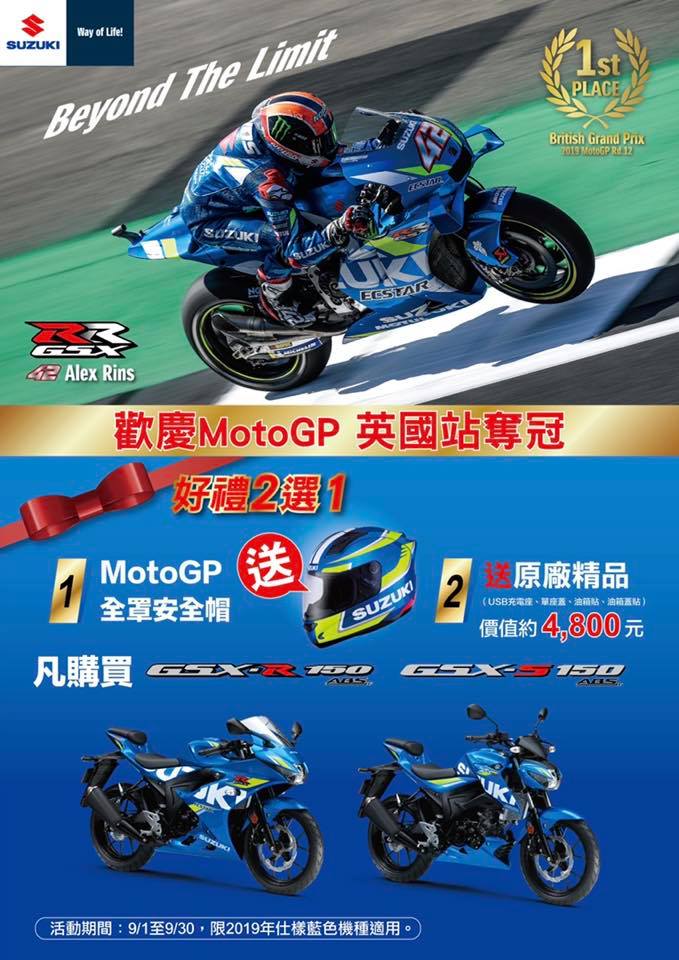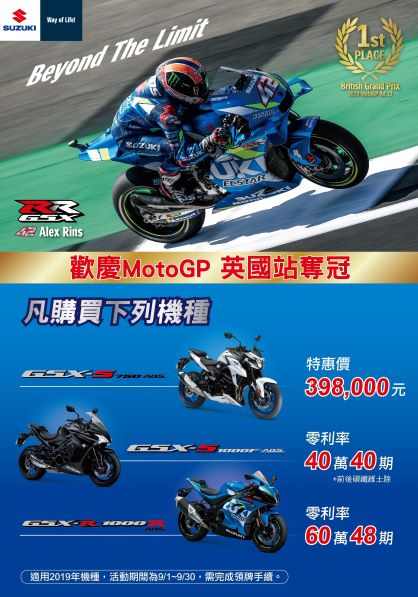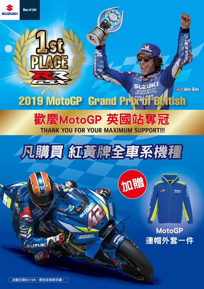 Team SUZUKI Ecstar 42號車手Alex Rins 於MotoGP英國站奪冠,SUZUKI為了感謝各位粉絲及車主的支持與愛戴,特別於9月1日起開始實施多種購車優惠專案,除了與各位分享奪冠的喜悅外,更要讓你好車輕鬆買,好禮帶回家。