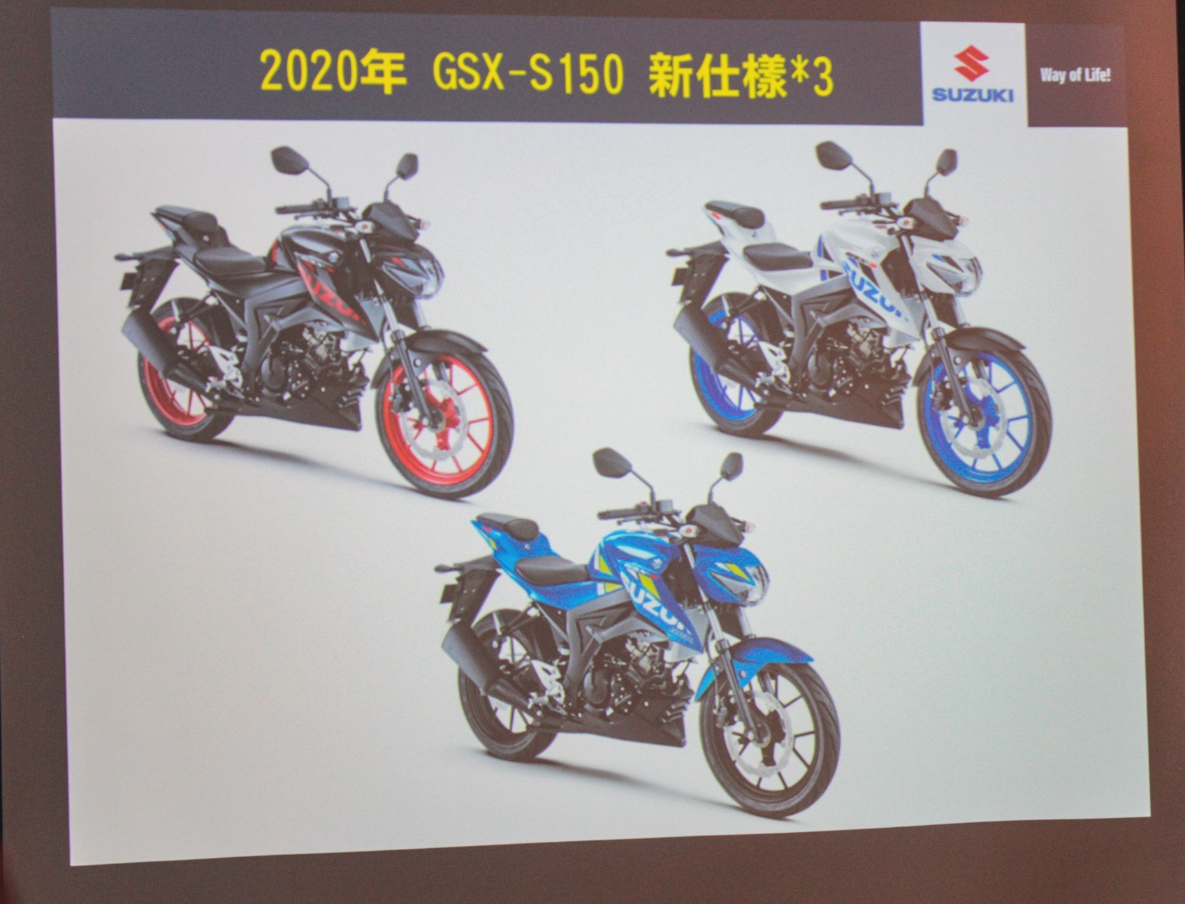 台鈴工業行銷課副理 李元鈞先生提及:「2020年全新GSX-R/S150 除了全新色彩外,更追加了全新配備,增加騎乘便利性與新潮酷炫感,GSX-R/S150 新增藍底高反差儀表及雙黃警示燈,而GSX-R150則追加Keyless 感應炫光環、金色塗裝卡鉗、與高質感鈦金屬色上三角台,提高給喜愛小阿魯的朋友們,高質感高價值感的絕佳感受。」