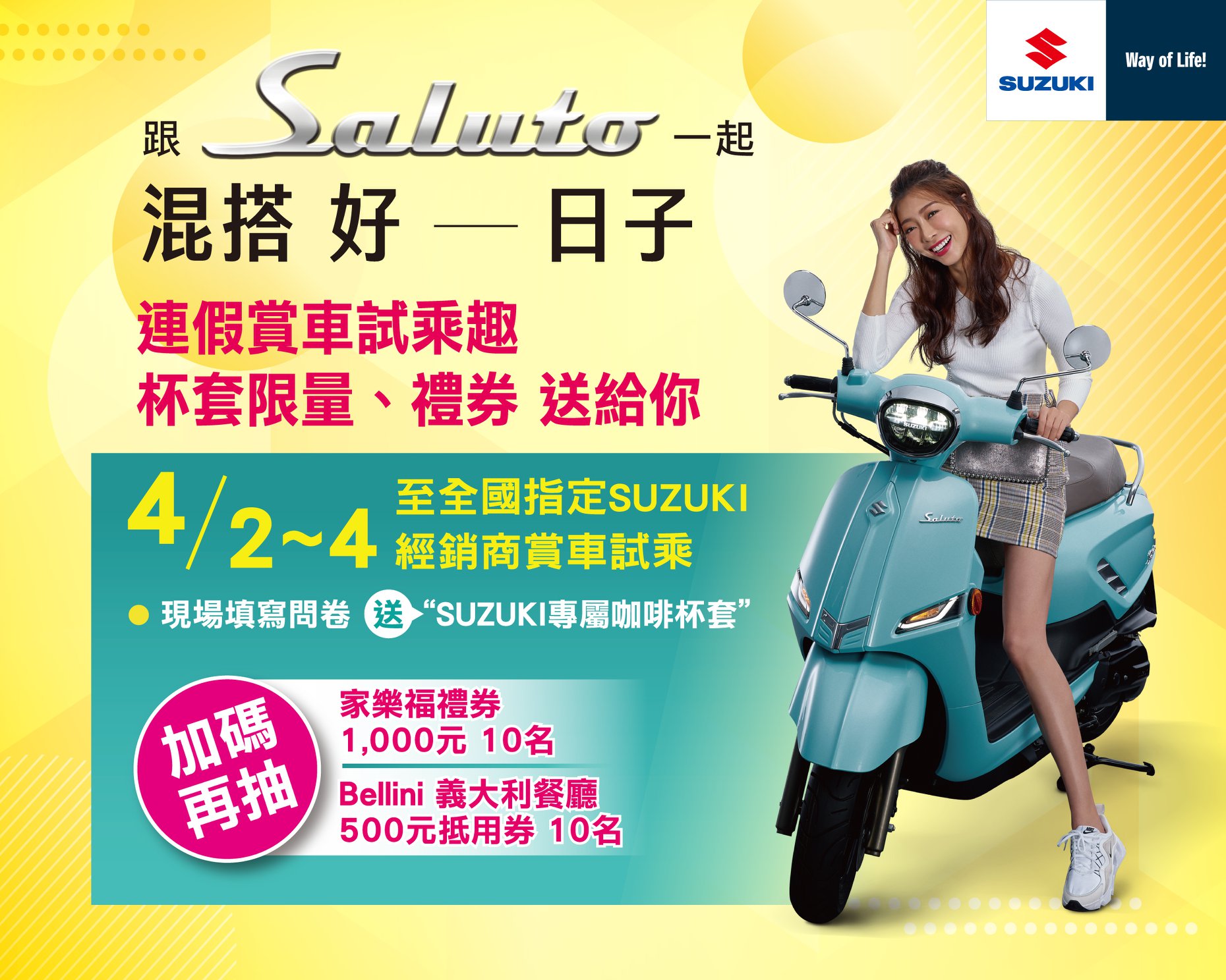 4/2~4/4,至全台SUZUKI機車指定經銷商試乘Saluto