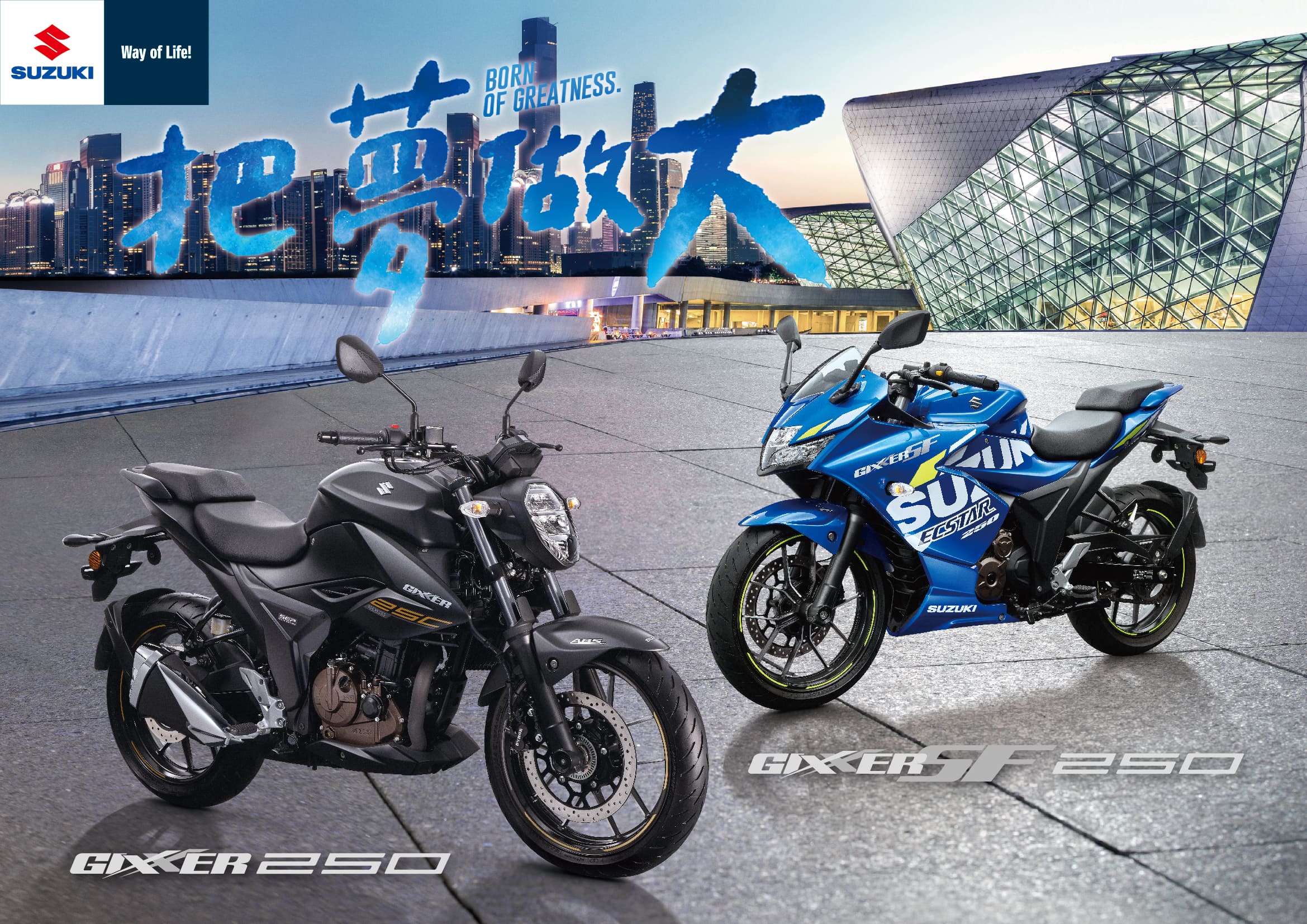 本次GIXXER 250系列為滿足消費者的個別喜好,特別引進街車款(GIXXER 250)以及跑車版(GIXXER SF 250),GIXXER 250擁有簡約流線身形,俐落的街車設計,使您通勤遊玩從容自在;GIXXER SF 250搭載重車級全整流罩,源自SUZUKI的跑格DNA,搭配分離式握把,在運動性與舒適性之間取得完美平衡,除了日常騎行外,亦可隨時熱血奔放;全車系推出沉穩內斂的冷勁黑,與SUZUKI當家的MotoGP藍,吸睛程度破表,讓您被目光追隨,回頭率百分百。