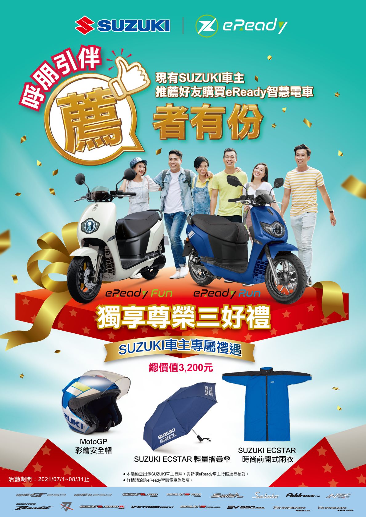 此外針對同屬於台鈴工業的SUZUKI既有車主,同樣推出"呼朋引伴,薦者有份”好康活動,即日起至2021/08/31止,只要是現任SUZUKI車主,推薦任一人購買eReady智慧電車任一車款,即贈”SUZUKI尊榮三好禮”,好禮內含”MotoGP彩繪安全帽”,” SUZUKI ECSTAR 輕量摺疊傘”,”SUZUKI ECSTAR 時尚前開式雨衣”,總價值達3,200元,SUZUKI車主專屬禮遇,只要你牽線,獨享好禮送給你,詳情請洽eReady智慧電車旗艦店。