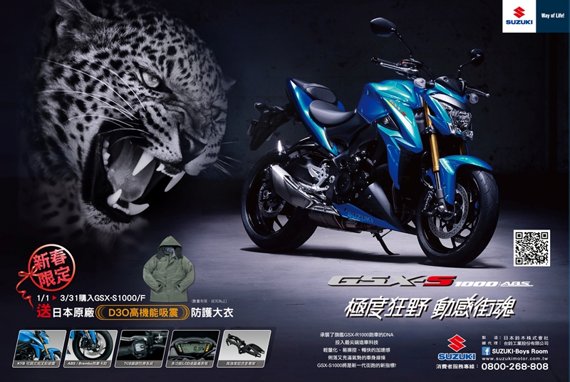 新春好禮送,1/1~3/31凡購買GSX-S1000 / GSX-S1000F, 就送日本SUZUKI有D3O 護具的【高機能吸震】防護大衣, D3O 護具是由「奈米級智慧分子」組成的抗衝擊材質, 在常態下呈現柔軟且具有彈性,當遇到高速衝撞或擠壓後 表面也將變得堅硬而足夠消化外力,讓您提升騎車安全性; SUZUKI永遠貼近您的心,讓騎乘更安全 (防護大衣由日本進口,提供二種L、LL尺寸,數量有限,送完為止)
