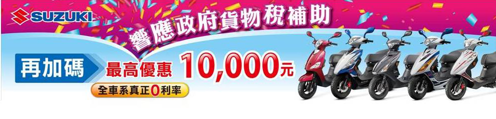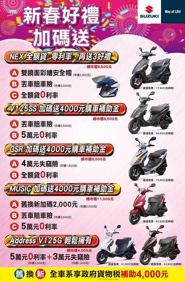 現在只要符合政府補助標準, MUSIC125可享最高10,000元優惠, GSR125、V125SS也都加碼至8,000元, 全車系再享0利率優惠, 過年牽新車,SUZUKI尚甘心!! 詳情請洽SUZUKI全國經銷商