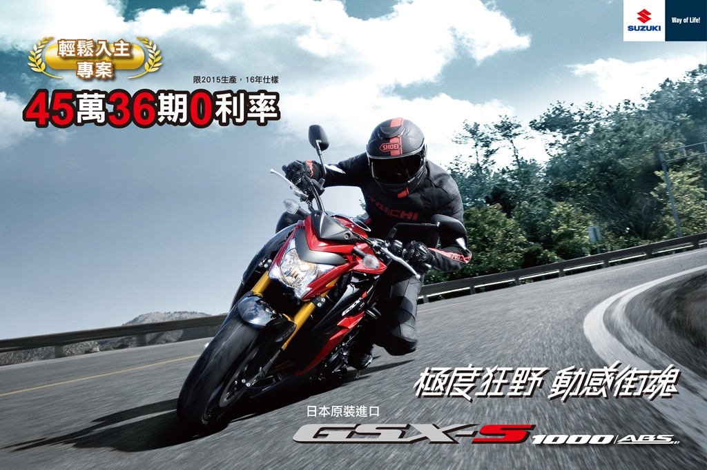 正值春暖花開的時節 適合騎著GSX-S1000/F 去熱血!!! 什麼? 你還沒擁有 GSX-S1000/F 嗎? 沒關係~ 即日起訂購 GSXX-S1000/F 即享分期好禮 分期優惠【45萬36期0利率】!!!! 讓你輕鬆入手 GSX-S1000/F *優惠 限2015年生產 16年仕樣