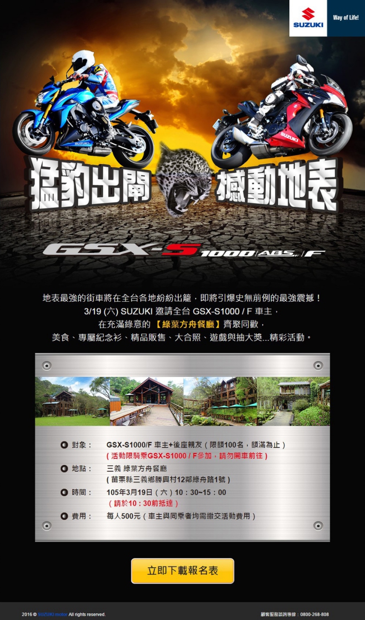 誰說強悍就註定孤傲漂泊? SUZUKI 即將在3/19(六)於「三義 綠葉方舟」舉辦 GSX-S1000 車聚! 在此號召擁有「豹」一般狂野靈魂的GSX-S 1000車友們, 與我們一同齊聚釋放街車動能! ☞抽大獎、齊歡唱、享美食