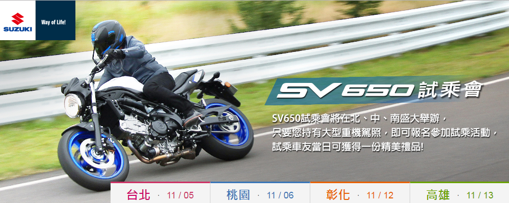 擁有大型重車駕照的你,快來駕馭最原始的操控欲望, 體驗SV650迅捷、靈敏又穩定的絕佳操控吧!