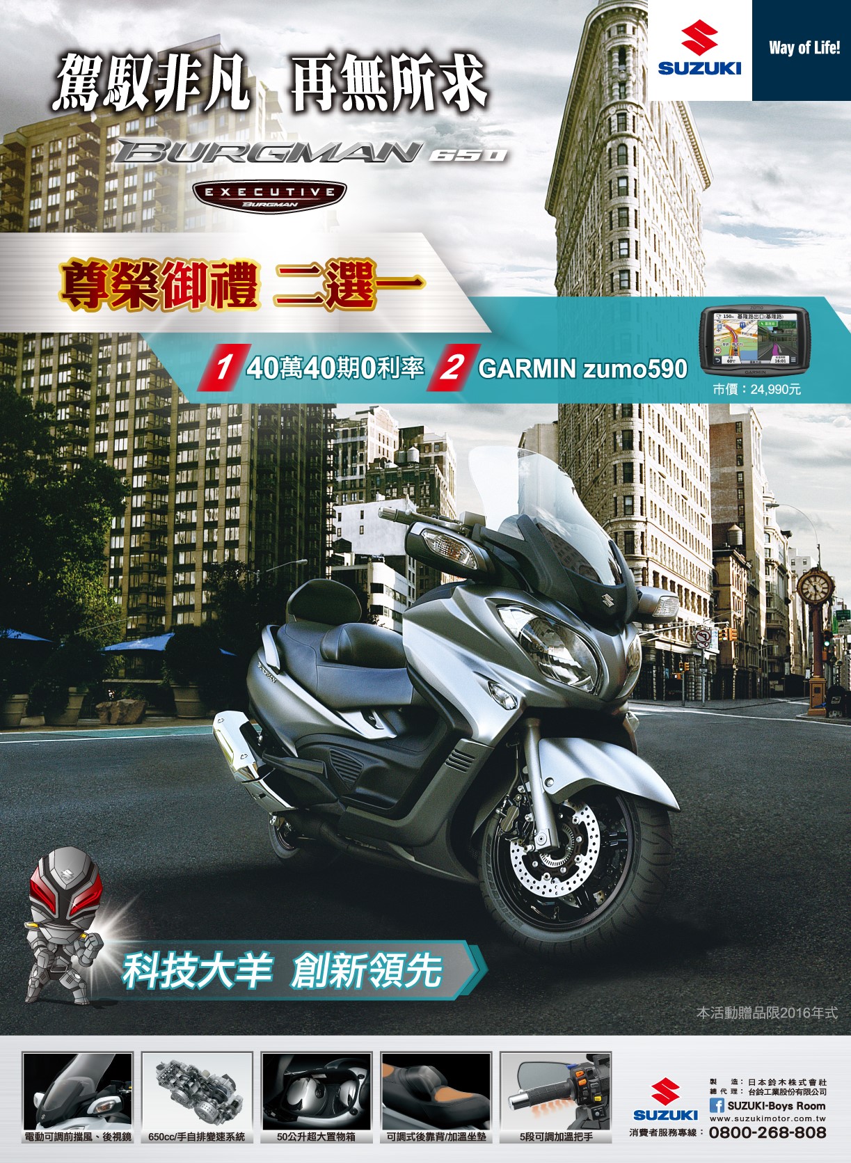 集科技與美學於一身的Burgman650 搭載電動風鏡、後照鏡、加溫把手, 與手自排電子變速系統....等先端配備, 即日起入主陸上豪華飛行艙, 立即享有尊榮御禮二選一: